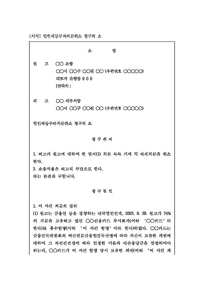 주요내용 : 과세당국(세무서)이 법인에게 부과한 법인세 처분에 이의가 있을 때, 당해 처분의 취소를 구하기 위한 목적으로 사용되어지는 소장 양식임단 무단전재 방지목적으로PDF 파일로 올리니구매하신 후 혹 원본 파일이 필요하신 분들은 톡이나 문자메일전화 등을 주시면 작성방법 등에 대한 간단한 무료상담과 함께 원본 파일을 보내드리도록 하겠습니다.