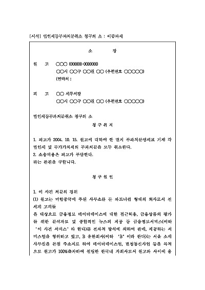 주요내용 : 과세당국(세무서)이 법인에게 부과한 법인세 처분에 이의가 있을 때당해 처분의 취소를 구하기 위한 목적으로 사용되어지는 소장 양식임단 무단전재 방지목적으로PDF 파일로 올리니구매하신 후 혹 원본 파일이 필요하신 분들은 톡이나 문자메일전화 등을 주시면 작성방법 등에 대한 간단한 무료상담과 함께 원본 파일을 보내드리도록 하겠습니다.