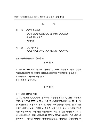 주요내용 : 과세당국(세무서)이 법인에게 부과한 법인세 처분에 이의가 있을 때당해 처분의 취소를 구하기 위한 목적으로 사용되어지는 소장 양식임단 무단전재 방지목적으로PDF 파일로 올리니구매하신 후 혹 원본 파일이 필요하신 분들은 톡이나 문자메일전화 등을 주시면 작성방법 등에 대한 간단한 무료상담과 함께 원본 파일을 보내드리도록 하겠습니다.