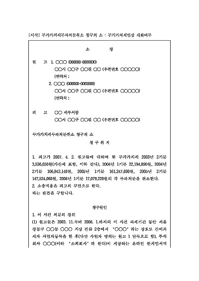 주요내용 : 과세당국(세무서)이 내린 위법 또는 부당한 부가가치세 부과 결정에 대한 납세자가 당해 처분의 취소를 구하기 위한 목적으로 사용되어지는 소장 양식임. 단 무단전재 방지목적으로PDF 파일로 올리니, 구매하신 후 혹 원본 파일이 필요하신 분들은 톡이나 문자, 메일, 전화 등을 주시면 작성방법 등에 대한 간단한 무료상담과 함께 원본 파일을 보내드리도록 하겠습니다.