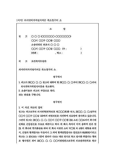 주요내용 : 주무관청으로부터 의사면허자격정지처분을 받고 당해 처분의 위법 또는 부당성을 이유로 그 처분의 취소 등을 구하기 위한 목적으로 사용되어지는 청구서 양식임. 단 무단전재 방지목적으로 PDF 파일로 올리니, 구매하신 후 혹 원본 파일이 필요하신 분들은 톡이나 문자, 메일, 전화 등을 주시면 작성방법 등에 대한 간단한 무료상담과 함께 원본 파일을 보내드리도록 하겠습니다.