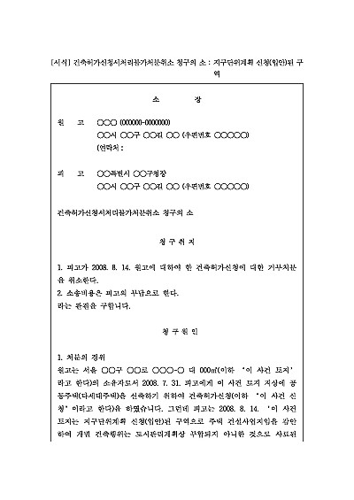 주요내용 : 건축주가 건축허가 신청을 했는데 행정청이 법령상 이유를 들어 허가를 내주지 않는 '불허가(반려) 처분'을 내렸을 때, 이에 불복하여 당해 처분의 위법 또는 부당함을 이유로 그 취소 등을 구할 목적으로 사용되어지는 소장 양식임. 단 무단전재 방지목적으로 PDF 파일로 올리니, 구매하신 후 혹 원본 파일이 필요하신 분들은 톡이나 문자, 메일, 전화 등을 주시면 작성방법 등에 대한 간단한 무료상담과 함께 원본 파일을 보내드리도록 하겠습니다.