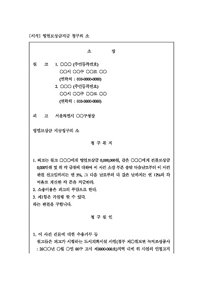 주요내용 : 공익사업의 시행으로 인해 영업장이 수용되거나 영업을 할 수 없게 되었을 때 당해 손해를 보상 받기 위한 목적으로 사용되어지는 소장 양식임. 단 무단전재 방지목적으로 PDF 파일로 올리니, 구매하신 후 혹 원본 파일이 필요하신 분들은 톡이나 문자, 메일, 전화 등을 주시면 작성방법 등에 대한 간단한 무료상담과 함께 원본 파일을 보내드리도록 하겠습니다.
