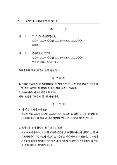 주요내용 : 공익사업으로 토지가 강제 수용될 때, 결정된 보상금이 시세보다 낮다고 판단될 경우, 토지소유자가 중앙토지수용위원회 재결에 불복하여 이의신청을 거쳐 법원에 보상금 증액을 청구할 목적으로 사용되어지는 소장 양식임. 단 무단전재 방지목적으로 PDF 파일로 올리니, 구매하신 후 혹 원본 파일이 필요하신 분들은 톡이나 문자, 메일, 전화 등을 주시면 작성방법 등에 대한 간단한 무료상담과 함께 원본 파일을 보내드리도록 하겠습니다.