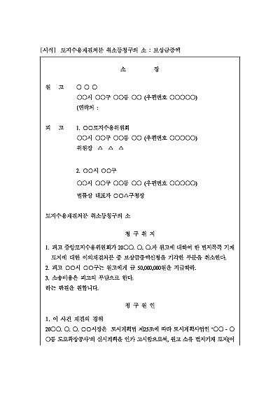 주요내용 :공익사업을 위한 토지 수용 과정에서 내려진 토지수용위원회(토수위)의 재결 처분이 위법하거나 부당할 때 그 취소를 구하기 위한 목적으로 사용되어지는 소장 양식임. 단 무단전재 방지목적으로 PDF 파일로 올리니, 구매하신 후 혹 원본 파일이 필요하신 분들은 톡이나 문자, 메일, 전화 등을 주시면 작성방법 등에 대한 간단한 무료상담과 함께 원본 파일을 보내드리도록 하겠습니다.