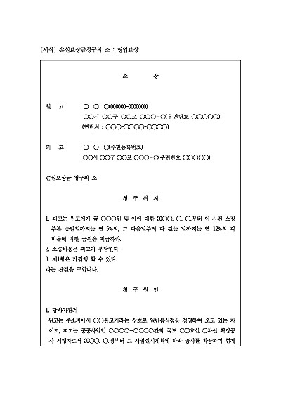 주요내용 : .공익사업(재개발, 도로 건설 등) 시행으로 인해 영업장소가 수용되거나 영업이 중단되어 발생하는 영업손실에 대해 사업시행자에게 보상을 요구하는 권리이며, 이는 보통 휴업손실보상(약 4개월분 영업이익) 및 이전비, 이사비 등을 포함하여 청구할 때 사용되어지는 소장 양식임. 단 무단전재 방지 목적으로 PDF 파일로 올리니, 구매하신 후 혹 원본 파일이 필요하신 분들은 톡이나 문자, 메일, 전화 등을 주시면 작성 방법 등에 대한 간단한 무료 상담과 함께 원본 파일을 보내드리도록 하겠습니다.