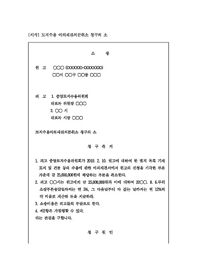 주요내용 : 공익사업을 위한 토지수용 과정에서 지방토지수용위원회의 최초 수용재결이나 중앙토지수용위원회의 이의재결에 불복하여, 해당 재결의 위법·부당함을 다투기 위해 제기하는 소장 양식임. 단 무단전재 방지 목적으로 PDF 파일로 올리니, 구매하신 후 혹 원본 파일이 필요하신 분들은 톡이나 문자, 메일, 전화 등을 주시면 작성 방법 등에 대한 간단한 무료 상담과 함께 원본 파일을 보내드리도록 하겠습니다.