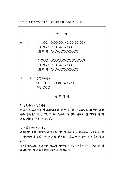 주요내용 : 공익사업(재개발, 도로 건설 등) 시행으로 인해 자신의 영업을 중단하거나 폐업하게 된 영업주가 사업 시행자에게 손해에 대한 배상을 요구할 때 사용되어지는 소장 양식임. 단 무단전재 방지 목적으로 PDF 파일로 올리니, 구매하신 후 혹 원본 파일이 필요하신 분들은 톡이나 문자, 메일, 전화 등을 주시면 작성 방법 등에 대한 간단한 무료 상담과 함께 원본 파일을 보내드리도록 하겠습니다.