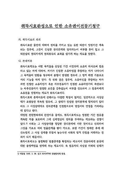 주요내용 : 취득시효 완성으로 인한 소유권이전등기청구의 소 제기시 청구취지는 어떻게 작성하여야 하고 또 청구원인에는 어떠한 요건사실을 기초로 어떠한 내용을 기재하며, 원고의 주요 공격방법은 무엇이 있고, 또 피고의 답변서 및 준비서면 등 작성시 주요 항변사유는 어떠한 것들이 있는 지를 모두 기재함으로써, 관련 소송 진행 및 방어시 전문가 수준의 실제 소송이 가능한 필수적이고 핵심적인 지식들이 모두 수록 하였습니다