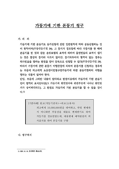 주요내용 : 가등기에 기한 본등기 청구의 소 제기시 청구취지는 어떻게 작성하여야 하고 또 청구원인에는 어떠한 요건사실을 기초로 어떠한 내용을 기재하며, 원고의 주요 공격방법은 무엇이 있고, 또 피고의 답변서 및 준비서면 등 작성시 주요 항변사유는 어떠한 것들이 있는 지를 모두 기재함으로써, 관련 소송 진행 및 방어시 전문가 수준의 실제 소송이 가능한필수적이고 핵심적인 지식들이 모두 수록 하였습니다
