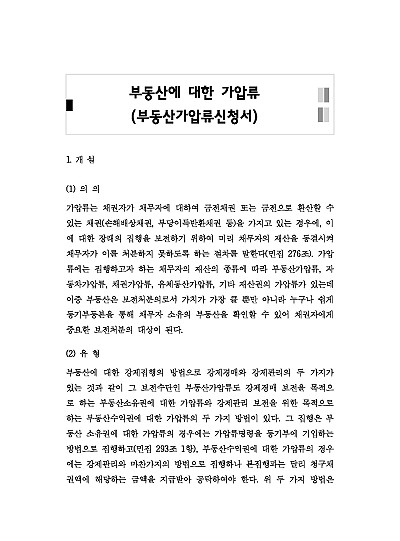 주요내용 : 부동산가압류신청이란, 채권자가 채무자로부터 받을 금전 채권(돈)을 확실히 받기 위해, 채무자의 특정 부동산(토지, 건물 등)이 처분되지 못하도록 법원의 명령으로 미리 묶어두는 임시 보전 조치를 신청하는 것입니다. 이는 채무자가 재산을 빼돌리거나 숨기는 것을 막아, 추후 본안소송에서 승소했을 때 강제집행을 통해 채권을 회수할 수 있도록 미리 재산을 확보하는 절차임, 본 내용은 그와 관련 된 부동산가압류의 개념, 신청방법, 비용, 담보제공기준, 소명방법, 관련 핵심판례 및 서식 등을 모두 기재해 둠으로서, 전문가적 시각에서 관련 절차를 진행할 수 있도록 정리하였다는 그 특징이 있다.