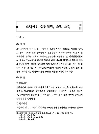 주요내용 : 소액사건이란 소송 목적의 값이 3천만 원을 초과하지 않는 민사사건으로, 일반 민사소송보다 신속하고 간편하게 진행하기 위해 만들어진 제도로, 청구 금액이 적은 경우 소송 비용이 저렴하고 변론 기일이 단축되며, 판결 이유를 기재하지 않을 수도 있다는 특징이 있음, 본 내용은 그와 관련 된 소액사건심판절차의 개념, 요건, 관할, 적용심급, 관련 핵심판례 및 서식들을 모두 기재해 둠으로서, 전문가적 시각에서 관련 절차를 진행할 수 있도록 정리하였다는 그 특징이 있다.