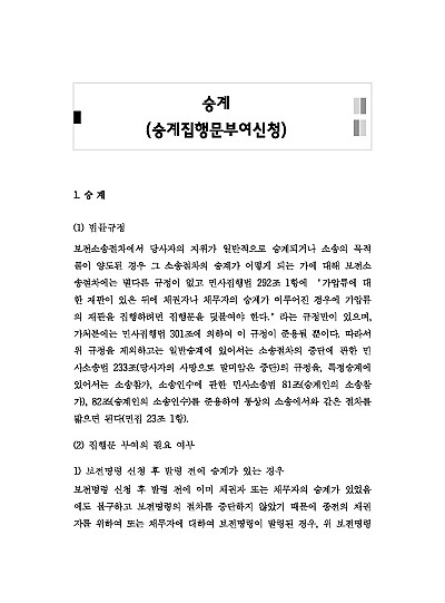 주요내용 : 승계집행문이란 기존의 확정판결이나 공정증서(집행권원)에 표시된 채권자나 채무자의 지위를 상속, 합병 등으로 이어받은 사람(승계인)에 대해 강제집행을 할 수 있도록 법원이 내어주는 특별한 집행문이며, 이는 사망한 채무자나 합병된 법인에 대한 집행력을 상속인이나 합병 후의 법인으로 확장시키는 역할을 하며, 승계사실을 증명하는 서류(가족관계증명서, 법인등기부등본 등)가 필요하고, 승계인에게 송달되어야 효력이 발생함, 본 내용은 그와 관련 된 승계집행문의 개념, 요건, 필요성, 관련 핵심판례 및 서식 등을 모두 기재해 둠으로서, 전문가적 시각에서 관련 절차를 진행할 수 있도록 정리하였다는 그 특징이 있다.