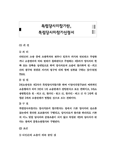 주요내용 : 독립당사자참가신청이란, 이미 진행 중인 다른 사람의 소송에서 소송의 목적 전부 또는 일부가 자기의 권리라고 주장하거나 소송 결과로 자신의 권리가 침해될 것이라고 주장하는 제3자가, 원고 또는 피고 양쪽 모두를 상대방으로 삼아 당사자로서 소송에 참여하는 제도임, 본 내용은 그와 관련 된 독립당사자참가신청의 개념, 요건, 참가신청, 심판, 관련 핵심판례 및 서식들을 모두 기재해 둠으로서, 전문가적 시각에서 관련 절차를 진행할 수 있도록 정리하였다는 그 특징이 있다.