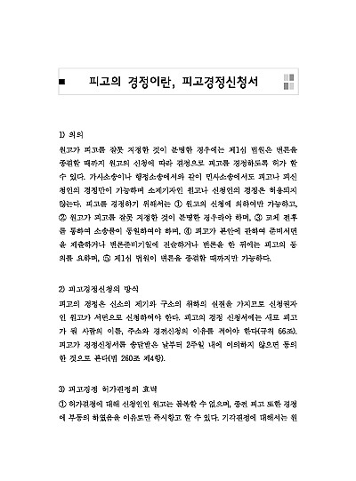 주요내용 :피고경정신청은 소송을 제기한 원고가 피고를 잘못 지정했을 때, 법원의 허가를 받아 피고를 올바른 사람이나 단체로 정정(변경)해달라고 신청하는 법적 절차로, 피고를 잘못 지정한 것이 명백한 경우(예: 주식회사가 아닌 대표이사 개인을 피고로 한 경우)에만 가능하며, 이는 소멸시효 중단 효과를 유지하며 소송을 계속 진행하기 위한 중요한 제도임, 본 내용은 그와 관련 된 피고경정의 개념, 신청방식, 경정결정의 효력, 관련 핵심판례 및 서식들을 모두 기재해 둠으로서, 전문가적 시각에서 관련 절차를 진행할 수 있도록 정리하였다는 그 특징이 있다.