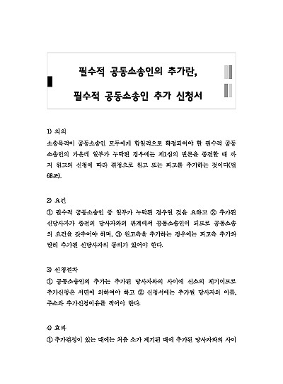 주요내용 :필수적 공동소송인 추가신청이란, 소송의 결과가 모든 당사자에게 통일적으로 적용되어야 하는 필수적 공동소송에서 누락된 당사자를 법원의 허가를 받아 소송에 참여시키는 절차로, 민사소송법 제68조에 근거하며, 소멸시효 중단 등의 효과를 위해 제1심 변론종결 전까지 신청해야 되고, 원고를 추가하려면 추가될 사람의 동의가 필수적이며, 신청이 허가되면 소송이 처음부터 제기된 것으로 간주됨, 본 내용은 그와 관련 된 필수적 공동소송인 추가의 개념, 요건, 신청절차, 관련 핵심판례 및 서식들을 모두 기재해 둠으로서, 전문가적 시각에서 관련 절차를 진행할 수 있도록 정리하였다는 그 특징이 있다.