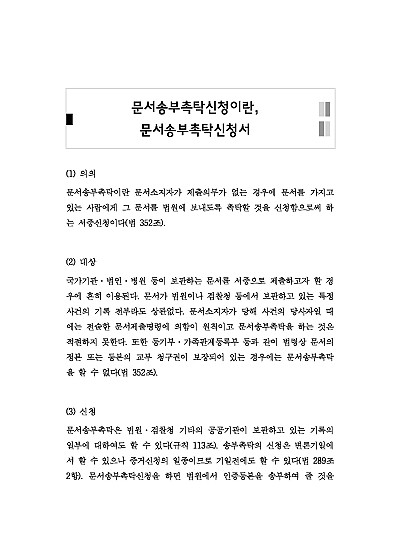 주요내용 : 문서송부촉탁신청은 소송 당사자가 자신의 주장을 입증하기 위해 필요한 문서가 국가기관, 법인, 병원 등 다른 제3자에게 보관되어 있을 때, 그 문서 소지자에게 법원이 직접 해당 문서를 보내달라고 요청(촉탁)하도록 신청하는 절차로, 문서제출 의무 여부와 관계없이 이용할 수 있는 증거신청 방식이며, 특히 형사사건 기록(교통사고, 의료사고 등)을 민사소송 증거로 제출할 때 많이 활용됨, 본 내용은 그와 관련 된 문서송부촉탁신청의 개념, 대상, 신청, 재판, 문서송부, 인증등본송부촉탁제도, 문서도착 후 처리, 관련 핵심판례 및 서식들을 모두 기재해 둠으로서, 전문가적 시각에서 관련 절차를 진행할 수 있도록 정리하였다는 그 특징이 있다.