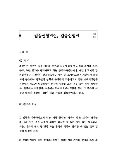 주요내용 : 검증신청이란 법관이 사건 관련 현장이나 물건의 상태를 직접 보고, 듣고, 오감으로 확인하여 증거를 수집하는 증거조사 방법인 '검증(檢證)'을 신청하는 것을 말하며, 주로 사고 현장, 토지 경계, 건물 상태 등 당사자의 주장을 객관적으로 확인하기 위해 서면이나 구두로 법원에 요청하는 절차로써, 신청 시에는 검증 목적, 대상, 확인할 사항을 명확히 하고, 현장 상황을 담은 도면이나 안내 방법 등을 구체적으로 준비하여 제출해야 함, 본 내용은 그와 관련 된 검증의 개념, 대상, 방법, 절차, 관련 핵심판례 및 서식들을 모두 기재해 둠으로서, 전문가적 시각에서 관련 절차를 진행할 수 있도록 정리하였다는 그 특징이 있다.