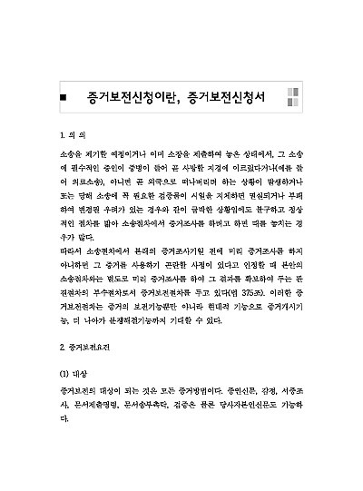 주요내용 : 증거보전신청이란, 소송 진행 중 또는 소송 제기 전 증거가 사라지거나 훼손될 우려가 있을 때, 법원에 미리 증거를 조사하여 확보해 달라고 요청하는 절차로, 주로 CCTV 영상, 증인신문 등을 미리 해두어 나중에 증거를 잃지 않도록 하는 제도이며, 이는 시간이 지나면 보관 기간이 짧아 삭제되거나 개인정보보호 문제로 확보가 어려운 CCTV 영상(예: 상간자 소송)이나, 증인이 출석하지 못할 수 있는 증인을 미리 신문하는 경우 등에 활용됨, 본 내용은 그와 관련 된 증거신청의 개념, 요건, 절차, 효과, 관련 핵심판례 및 서식들을 모두 기재해 둠으로서, 전문가적 시각에서 관련 절차를 진행할 수 있도록 정리하였다는 그 특징이 있다.