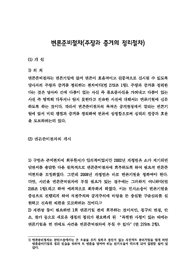 주요내용 : 변론준비절차란 민사소송에서 실제 변론기일 전에 당사자의 주장과 증거를 미리 정리하여 변론이 효율적이고 집중적으로 진행되도록 하는 절차로, 주로 서면 공방과 변론준비기일을 통해 쟁점과 입증 계획을 명확히 하는 과정임, 본 내용은 그와 관련 된 변론준비절차의 개념, 개시, 진행, 변론준비기일에의 변론준비절차, 변론준비절차 종결의 효과, 종결 후 변론운영 등의 내용들을 모두 기재해 둠으로서, 전문가적 시각에서 관련 절차를 진행할 수 있도록 정리하였다는 그 특징이 있다.