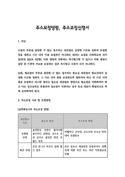 주요내용 : 주소보정명령이란, 소송 서류를 상대방에게 보내려 했으나 주소를 몰라 송달이 안 될 때, 법원이 원고(소송 제기자)에게 상대방의 정확한 주소를 찾아서 다시 제출하라고 내리는 명령으로, 원고는 이 명령을 받아 주민센터에서 주민등록초본을 발급받아 새로운 주소로 보정하는 절차로, 주소보정 명령에 따라 주소를 보정하지 않으면 소송이 각하될 수 있음, 본 내용은 그와 관련 된 주소보정명령의 개념, 보정사유, 각 사유별 보정방법, 관련 서식들을 모두 기재해 둠으로서, 전문가적 시각에서 관련 절차를 진행할 수 있도록 정리하였다는 그 특징이 있다.