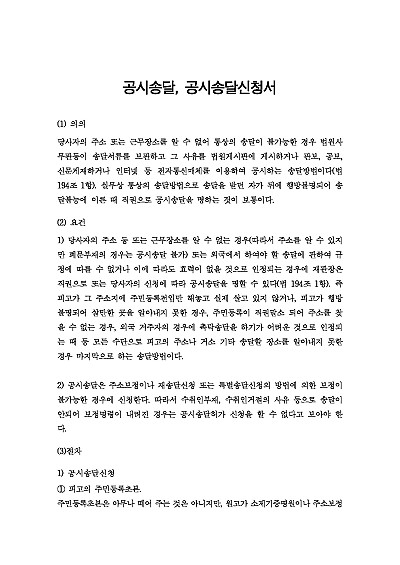 주요내용 : 공시송달은 소송 서류를 전달받을 상대방의 주소 등을 알 수 없을 때, 법원 게시판이나 신문 등에 서류를 보관 중이니 찾아가라는 내용을 공고하여 법적으로 송달된 것으로 간주하는 송달 방법으로, 보통 게시 후 2주가 지나면 효력이 발생하여 소송 절차를 계속 진행되고, 주소 불명 등 서류 전달이 어려울 때 이용하며, 당사자 신청이나 법원 직권으로 진행됨, 본 내용은 그와 관련 된 공시송달의 개념, 요건, 절차, 효과, 관련 서식(공시송달신청서, 불거주확인서 등)들을 모두 기재해 둠으로서, 전문가적 시각에서 관련 절차를 진행할 수 있도록 정리하였다는 그 특징이 있다.