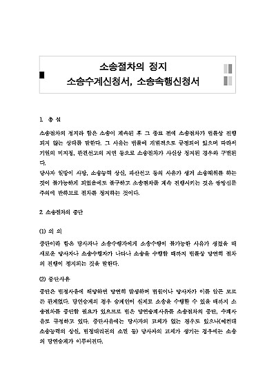 주요내용 : 소송수계신청이란 소송 진행 중 당사자 사망, 법인 소멸 등으로 소송 절차가 중단되었을 때, 상속인이나 법인 지위 승계인 등 새로운 당사자가 소송을 계속 이어가기 위해 법원에 하는 신청으로, 중단된 소송을 다시 진행시키기 위한 절차입니다. 신청 시 소송 중단 사유와 수계할 사람의 자격을 증명하는 서류를 첨부하여 법원에 서면으로 제출해야 됨, 본 내용은 그와 관련 된 소송중단의 개념 및 요건, 수계신청권자, 관할, 신청절차, 관련 핵심판례 및 서식(소송수계신청서 등)들을 모두 기재해 둠으로서, 전문가적 시각에서 관련 절차를 진행할 수 있도록 정리하였다는 그 특징이 있다.