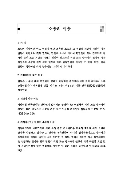 주요내용 : 소송의 이송이란, 이미 특정 법원에 계속 중인 소송을 법원의 재판을 통해 다른 법원으로 옮기는 절차를 말하며, 이는 관할권이 잘못된 경우(관할 위반) 또는 소송의 편의나 경제를 위해(재량 이송) 주로 이루어지는데, 소송이 적절한 관할 법원에서 진행되도록 하거나, 당사자에게 불필요한 손해나 지연을 피하기 위한 목적임, 본 내용은 그와 관련 된 소송 이송의 개념, 소송이송의 사유, 관련 서식들을 모두 기재해 둠으로서, 전문가적 시각에서 관련 절차를 진행할 수 있도록 정리하였다는 그 특징이 있다.