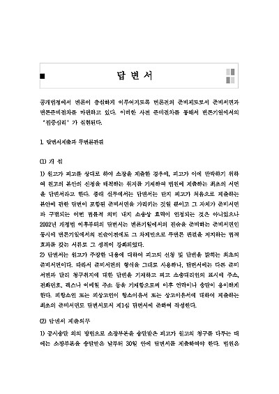 주요내용 : 답변서란 민사소송에서 소장을 받은 피고가 원고의 청구 내용에 대해 자신의 입장을 밝히기 위해 법원에 제출하는 첫 번째 서류로, 원고의 주장을 인정하는지, 반박하는지 등을 명시하며 소송의 쟁점을 구체화하는 중요한 서면입니다. 소장 부본을 송달받은 날부터 30일 이내에 제출해야 하며, 미제출 시 원고의 청구를 모두 인정하는 것으로 간주되어 판결이 내려질 수 있어 신속하고 정확한 작성 및 제출이 중요함, 본 내용은 그와 관련 된 답변서의 개념, 무변론 판결의 대상, 청구취지에 대한 답변, 청구원인에 대한 답변 방법, 관련 핵심판례 및 서식들을 모두 기재해 둠으로서, 전문가적 시각에서 관련 절차를 진행할 수 있도록 정리하였다는 그 특징이 있다.