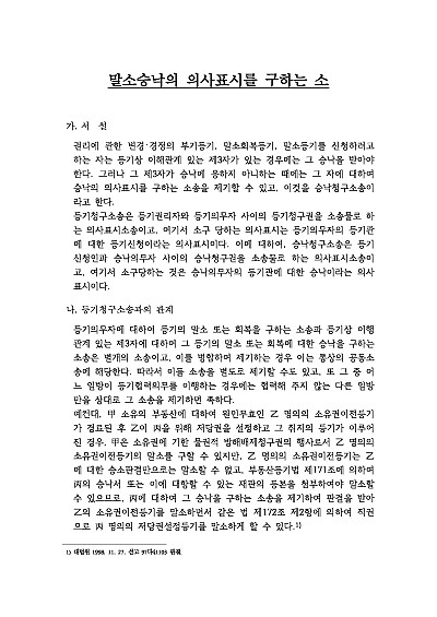 주요내용 : 말소승낙의 의사표시를 구하는 청구의 소 제기시 청구취지는 어떻게 작성하여야 하고 또 청구원인에는 어떠한 요건사실을 기초로 어떠한 내용을 기재하며, 원고의 주요 공격방법은 무엇이 있고, 또 피고의 답변서 및 준비서면 등 작성시 주요 항변사유는 어떠한 것들이 있는 지 나아가 관련 핵심 판례들까지 모두 기재함으로써, 관련 소송 진행 및 방어시 전문가 수준의 실제 소송이 가능한 필수적이고 핵심적인 지식들이 모두 수록 하였습니다