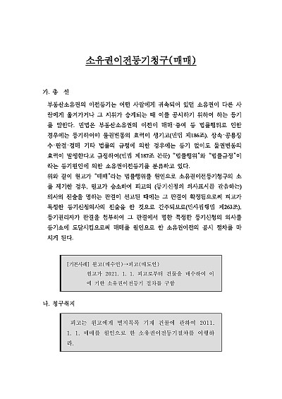 주요내용 : 소유권이전등기청구(매매)청구의 소 제기시 청구취지는 어떻게 작성하여야 하고 또 청구원인에는 어떠한 요건사실을 기초로 어떠한 내용을 기재하며, 원고의 주요 공격방법은 무엇이 있고, 또 피고의 답변서 및 준비서면 등 작성시 주요 항변사유는 어떠한 것들이 있는 지 나아가 관련 사례 및 핵심 판례들까지 모두 기재함으로써, 관련 소송 진행 및 방어시 전문가 수준의 실제 소송이 가능한 필수적이고 핵심적인 지식들이 모두 수록 하였습니다