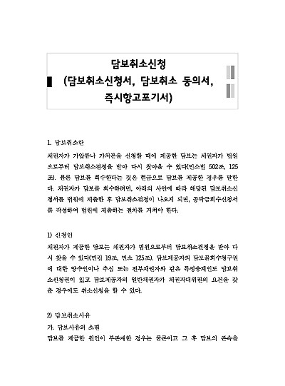 담보취소신청 (담보취소신청서, 담보취소 동의서, 즉시항고포기서) : 개념, 취소사유, 소송완결 후 권리취고 행사, 불복방법, 관련 핵심판례 및 서식 등 요약정보 및 구매