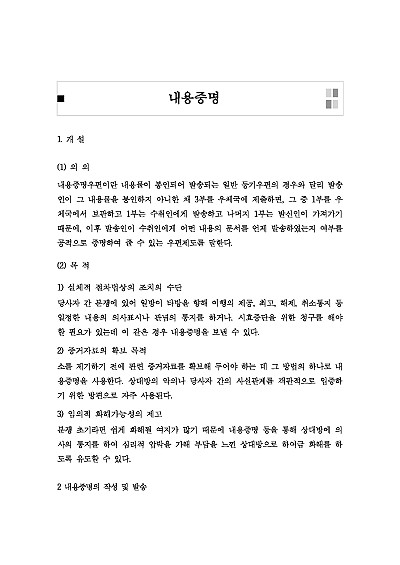 주요내용 : 내용증명은 발송인이 특정 내용의 문서를 언제 누구에게 보냈는지 우체국이 공적으로 증명해주는 제도이며, 법적 강제력은 없지만, 나중에 법적 분쟁이 발생했을 때 증거 자료로 활용되며, 계약 해제나 채권 양도 통지 등 법적 효력 발생의 필수 요건을 충족시키는 중요한 증명 수단이 됨. 본 내용은 그와 관련 된 내용증명의 개념, 목적, 작성방법, 발송방법, 내용증명의 효력, 발송후 조치, 관련 서식들을 모두 기재해 둠으로서, 전문가적 시각에서 관련 절차를 진행할 수 있도록 정리하였다는 그 특징이 있다.