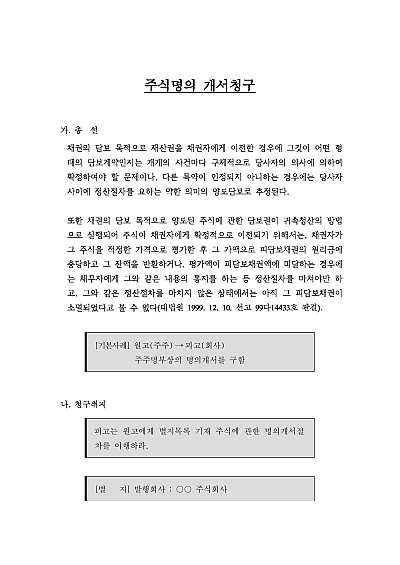 주식명의 개서청구의 소 : 청구취지 및 청구원인 기재방법, 주요 공격방법, 항변사유, 핵심 판례 기재 요약정보 및 구매