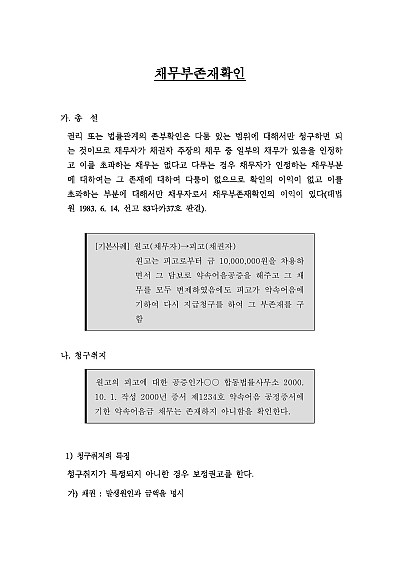 주요내용 : 채무부존재확인의 소 제기시 청구취지는 어떻게 작성하여야 하고 또 청구원인에는 어떠한 요건사실을 기초로 어떠한 내용을 기재하며, 원고의 주요 공격방법은 무엇이 있고, 또 피고의 답변서 및 준비서면 등 작성시 주요 항변사유는 어떠한 것들이 있는 지 나아가 관련 사건 핵심 판례 및 기재례들까지 모두 기재함으로써, 관련 소송 진행 및 방어시 전문가 수준의 실제 소송이 가능한 필수적이고 핵심적인 지식들이 모두 수록 하였습니다