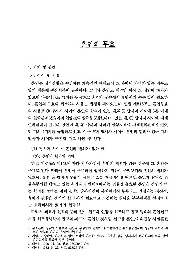주요내용 : 혼인무효란 법률상 혼인 성립 요건을 갖추지 못하여 혼인 자체가 처음부터 효력이 없었던 것으로 간주하는 제도이며, 이혼이 유효한 혼인을 해소하는 것과 달리 소급효가 있어 혼인 관계가 아예 존재하지 않았던 것으로 취급됩니다. 주로 혼인의사 합의 부재나 근친혼(8촌 이내 혈족) 등 민법 제815조에 명시된 사유가 있을 때 성립하며, 가족관계등록부 정정, 재산범죄 처벌 가능 등 법적 효과가 이혼과 다름, 본 내용은 그와 관련 된 혼인의 무효 주요내용 : 혼인무효란 법률상 혼인 성립 요건을 갖추지 못하여 혼인 자체가 처음부터 효력이 없었던 것으로 간주하는 제도이며, 이혼이 유효한 혼인을 해소하는 것과 달리 소급효가 있어 혼인 관계가 아예 존재하지 않았던 것으로 취급됩니다. 주로 혼인의사 합의 부재나 근친혼(8촌 이내 혈족) 등 민법 제815조에 명시된 사유가 있을 때 성립하며, 가족관계등록부 정정, 재산범죄 처벌 가능 등 법적 효과가 이혼과 다름, 본 내용은 그와 관련 된 혼인의 무효 개념, 당사자, 관할, 심리, 판결의 효력, 관련 핵심 판례 및 서식들을 모두 기재해 둠으로서, 전문가적 시각에서 관련 절차를 진행할 수 있도록 정리하였다는 그 특징이 있다.들을 모두 기재해 둠으로서, 전문가적 시각에서 관련 절차를 진행할 수 있도록 정리하였다는 그 특징이 있다.