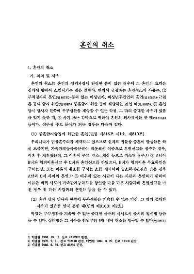 주요내용 : 혼인 전 또는 혼인 당시에 존재하였던 중대한 하자가 있어 법률혼의 효력을 장래를 향해 소멸시키고자 하는 소송으로서, 사기/강박에 의한 혼인, 혼인 연령 미달, 중혼, 부부 생활을 계속하기 어려운 악질 등의 사유가 있을 때 가정법원에 제기하며, 이혼과 달리 소급효는 없으나 재산분할/위자료 청구와 자녀의 지위는 이혼과 유사하게 다룸, 본 내용은 그와 관련 된 혼인의 취소 개념 및 사유, 취소기간, 당사자, 관할, 심리, 취소권 소멸, 소의 이익, 손해배상, 판결의 효력, 관련 핵심판례 및 서식들을 모두 기재해 둠으로서, 전문가적 시각에서 관련 절차를 진행할 수 있도록 정리하였다는 그 특징이 있다.