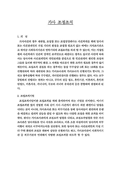 주요내용 : 이혼 등 가사사건에서 법원이 당사자들의 합리적 해결을 돕기 위해 내리는 명령으로, 상담, 심리검사, 치료 등을 통해 부부갈등을 완화하고 이성적 결정을 유도하는 조치이며, 사실관계 파악 위주인 '가사조사'와 달리 당사자의 정서적 안정과 관계 개선에 중점을 두는데, 이는 가사조사관이나 전문 상담위원이 주관하며, 당사자 본인의 직접 출석과 진술이 중요하고, 이혼 심리 검사 등 구체적인 방식은 법원의 판단에 따라 진행됨, 본 내용은 그와 관련 된 가사 조정조치의 개념, 특징, 기일, 유형, 관련 서식들을 모두 기재해 둠으로서, 전문가적 시각에서 관련 절차를 진행할 수 있도록 정리하였다는 그 특징이 있다.