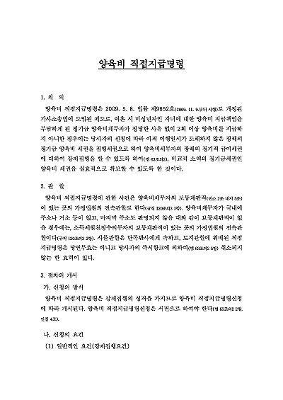 양육비직접지급명령신청이란 양욱비를 지급하지 아니하는 상대방의 급여채권에 대하여 법원이채무자의 회사에게 직접 양육비를 지급하고 명령하는 제로, 이는 양육비 채무자가 2회 이상 양육비를 지급하지 않았을 때, 양육비 채권자가 자신의 신청으로 받아낼 수 있으며, 이를 통해 안정적으로 양육비를 확보하는 방법임, 본 내용은 그와 관련된 양육비직접지급명령신청의 개념, 관할, 절차의 개시(신청서 기재사항, 첨부서류 등), 심리, 불복방법, 양육비직접지급명령의 효력, 관련 판례 및 서식들을 모두 기재해 둠으로서, 전문가적 시각에서 관련 절차를 진행할 수 있도록 정리하였다는 그 특징이 있다,