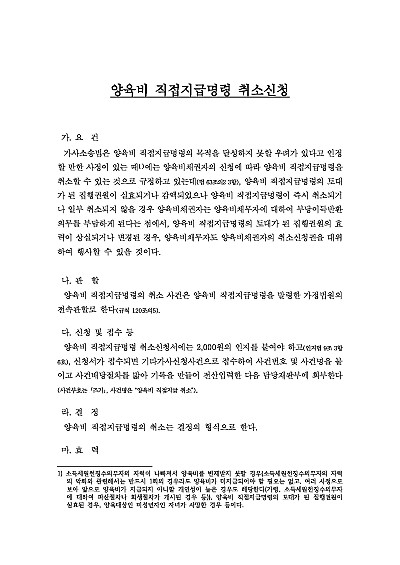 양육비직접지급명령 취소신청이란 양육직접지급명령의 효력을 장해를 향해 취소해 달라고 양육비채권자가 법원에 신청하는 절차로서, 채무자의 소득원 변경, 지급불능 등 우려 등 명령의 목적을 달성하기 어렵다고 판단될 때,혹은 채무자와 합의하여 다른 방식으로 양육비를 받기로 했을 때 주로 사용되어지는 신청서 양식임, 본 내용은 그와 관련된 양육비직접지급명령취소신청의 요건, 관할, 신청 및 접수, 효력, 관련 서식들을 모두 기재해 둠으로서, 전문가적 시각에서 관련 절차를 진행할 수 있도록 정리하였다는 그 특징이 있다,