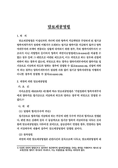 담보제공명령신청은 이혼 후 양육비를 정당한 이유 없이 지급하지 않는 채무자(상대방)에게 가정법원이 양육비 채무의 이행을 담보할 만한 상당한 재산을 제공하도록 명령하는 제도임. 본 내용은 그와 관련된 담보제공명령의 개념, 직권에 의한 담보제공명령 절차, 신청에 의한 담보제공명령 절차, 재판, 담보제공의 방법, 담보권 실행방법, 담보의 취소와 담보물변경, 관련 판례 및 서식들을 모두 기재해 둠으로서, 전문가적 시각에서 관련 절차를 진행할 수 있도록 정리하였다는 그 특징이 있다,