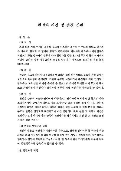 주요내용 : 이혼 후 친권자가 지정되지 않았거나, 지정된 친권자가 자녀의 복리를 위해 변경되어야 할 필요가 있을 때, 가정법원에 친권자를 지정하거나 기존 친권자를 변경해달라고 청구하는 법적 절차임, 본 내용은 그와 관련 된 친권자지정 및 변경의 개념, 친권자지정 방법, 친권자 변경방법, 당사자, 관할, 심리방법, 관련 핵심판례 및 서식들을 모두 기재해 둠으로서, 전문가적 시각에서 관련 절차를 진행할 수 있도록 정리하였다는 그 특징이 있다.