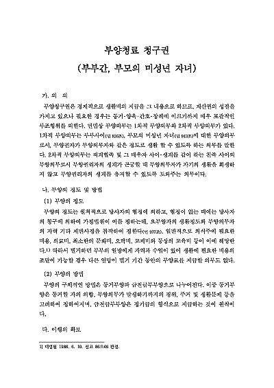 주요내용 : 혼인관계 중 경제적 능력이 있는 배우자가 생활비 등을 지급하지 않아 어려움을 겪는 배우자 등이 부부간의 부양의무를 근거하여 상대방에게 생활비 지급을 법적으로 요구하는 것으로서, 이혼 소송 진행 중이거나 별거 중에도 부양료 사전처분 신청 등을 통해 신청할 수 있으며 이는 생계 유지를 위한 중요한 법적 권리, 본 내용은 그와 관련 된 부양료청구의 개념, 당사자, 부양의 정도 및 방법, 이행방법, 청구권의 소멸, 관련 핵심판례 및 서식들을 모두 기재해 둠으로서, 전문가적 시각에서 관련 절차를 진행할 수 있도록 정리하였다는 그 특징이 있다.