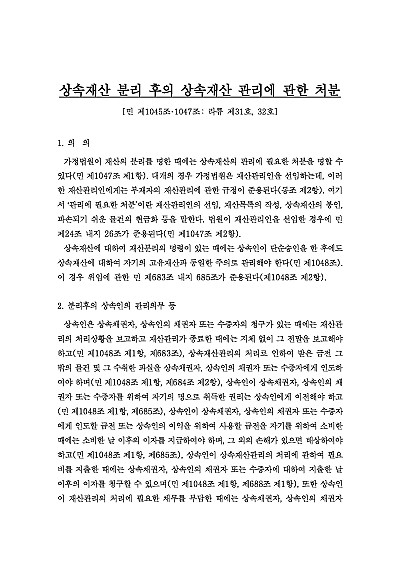 본 내용은 상속재산 분리 후 상속재산 관리에 관한 처분과 관련 된 분리 후 상속인ㄴ의 관리의무 등, 관할, 절차의 개시, 심리 및 심판절차 등의 내용 및 판례 등 핵심적인 사항들을 모두 기재해 둠으로써, 본 내용을 기초로 전문가적 시각에서 관련 절차를 진행할 수 있도록 정리하였습니다.