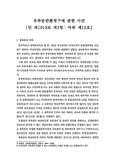 유류분반환청구 소송이란 고인 (피상속인)이 사망하기 전 혹은 유언으로 증여함으로써 재산을 상속인들에게 법정상속지분을 공평하게 증여한 것이 아닌 특정인에게 상속지분 이상으로 넘겨주었을 때 자신의 법정상속분을 정당하게 회복할 수 있도록 하는 청구권을 말하는데, 본 내용은 그와 관련된 유류분의 개념, 유류분 분 권리자, 유류분의 비율, 유류분 계산공식, 유류분의 산정, 실제 다양한 유형의 유류분산정 사례, 유류분의 기초가 되는 재산평가, 평가의 기준시, 유류분반환청구권 및 행사, 유류분침해액의 산정방법, 관련 판례들을 모두 기재해 둠으로서, 전문가적 시각에서 관련 절차를 진행할 수 있도록 정리하였다는 그 특징이 있다,
