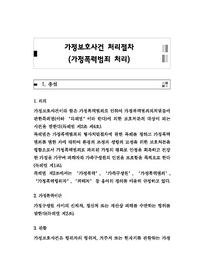 주요내용 : 가정보호사건 처리 절차는 가정폭력 발생시 형사처벌 대신 가정회복을 위해 법원이 보호처분을 내리는 과정으로, 신고 접수 후 법원이 조사관을 통해 실태를 조사하고, 심리 기일에 행위자와 피해자 의견을 들은 뒤, 행위자에게 상담, 치료, 접근금지 등의 보호처분을 내리고 이행을 감독하며, 재발 방지를 목표로 진행됨, 본 내용은 그와 관련 된 가정보호사건의 개념, 관할, 고소, 수사기관의 처리, 법원에서의 처리, 법원의 결정, 처분의 종류, 불복절차 등을 모두 기재해 둠으로서, 전문가적 시각에서 관련 절차를 진행할 수 있도록 정리하였다는 그 특징이 있다.