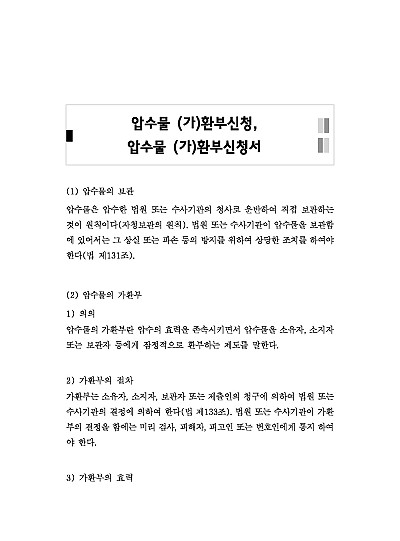 주요내용 : 압수물가환부신청이란 수사나 재판 과정에서 압수된 물건을 계속 압수할 필요가 없거나, 증거로서의 가치가 훼손되지 않는 선에서 소유자나 소지자가 임시로 돌려받기 위해 하는 신청으로, 형사소송법에 근거한 절차이며, 휴대폰, 노트북 등이 증거로 압수된 후에도 원형 보존 조치(사진 촬영 등)를 하고 사용하게 해달라고 요청하는 대표적인 사례가 있음, 본 내용은 그와 관련 된 압수물가환부 개념, 절차, 효력, 압수물 환부의 개념, 절차, 효력, 관련 핵심판례 및 서식들을 모두 기재해 둠으로서, 전문가적 시각에서 관련 절차를 진행할 수 있도록 정리하였다는 그 특징이 있다.