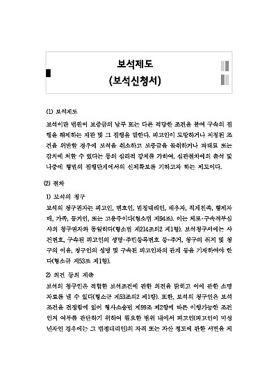 주요내용 : 보석허가신청이란, 구속된 피고인이 일정한 보증금(보석금) 납부 등을 조건으로 석방되도록 법원에 요청하는 절차로, 법원은 증거인멸이나 도주 우려가 적다고 판단할 때 보석을 허가하며, 보석이 허가되면 피고인은 정해진 보증금을 내고 풀려나 재판을 받게 되며, 만약 도주하거나 조건을 위반하면 보증금은 몰수 됨, 본 내용은 그와 관련 된 보석제도의 개념, 절차, 재판, 보석의 조건, 집행, 보석의 변경 및 취소, 관련 핵심판례 및 서식 등을 모두 기재해 둠으로서, 전문가적 시각에서 관련 절차를 진행할 수 있도록 정리하였다는 그 특징이 있다.