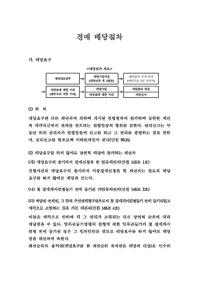 주요내용 : 경매배당절차란 경매로 매각된 부동산의 대금을 채권자들에게 법적으로 정해진 순위와 금액에 따라 나누어 주는(변제하는) 과정을 말하며, 이는 채무자의 빚을 갚고 채권자들의 권리를 공정하게 실현하기 위한 핵심적인 법적 절차로, 이 절차에서 법원은 배당표를 작성하고 배당기일을 정하며, 채권자는 배당표에 이의가 있을 경우 배당기일에 구술로 이의를 제기하고 일정 기간 내에 배당이의의 소를 제기할 수 있다, 본 내용은 배당절차와 관련된 배당요구, 배당요구 방식, 기한, 배당요구의 효력, 배당요구 철회, 채권신고, 배당금액, 배당채권자, 배당순위, 배당기일, 배당의 실시, 배당이의의 소송, 관련 핵심판례 및 서식들을 모두 기재해 둠으로서, 전문가적 시각에서 관련 절차를 진행할 수 있도록 정리하였다는 그 특징이 있다.