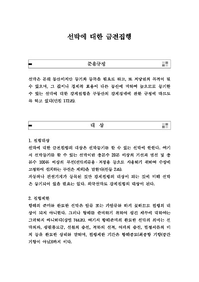 주요내용 : 채무자가 갚아야 할 돈(금전채권)을 받기 위해 채무자 소유의 선박을 법적으로 압류하고 경매 등 강제적인 방법을 통해 현금화하여 채권자에게 변제하는 절차로, 부동산 강제집행과 유사하게 진행되지만 선박이라는 특수성을 반영한 규정을 적용받는다, 본 내용은 그와 관련 된 개념, 준용규정, 집행대상, 관할, 특례규정, 선박지분에 대한 강제 경매, 선박을 목적으로 하는 담보권 실행을 위한 경매, 관련 핵심판례 및 서식들을 모두 기재해 둠으로서, 전문가적 시각에서 관련 절차를 진행할 수 있도록 정리하였다는 그 특징이 있다.